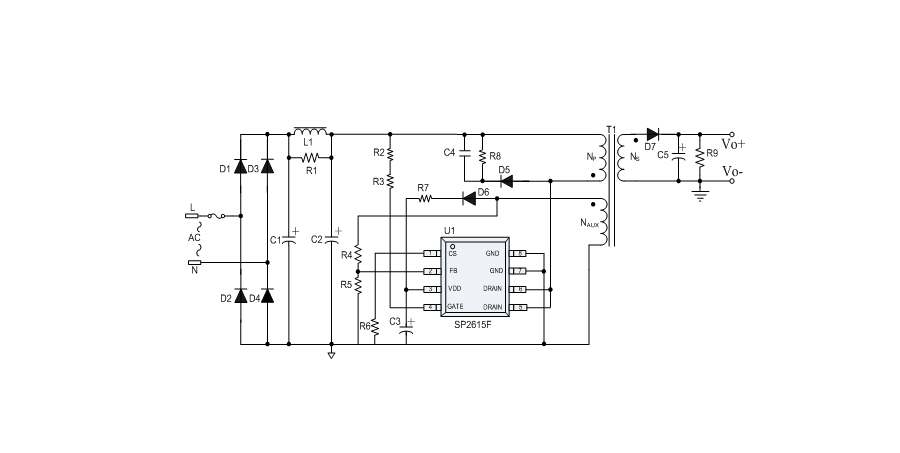 SP2615F是一款性能優(yōu)異的原邊反饋控制電路,應(yīng)用于小功率AC/DC充電器與適配器??刂齐娐肥褂迷叢蓸蛹夹g(shù)進(jìn)行精確的恒流、恒壓控制,可以省去一般應(yīng)用中的光耦與TL431。