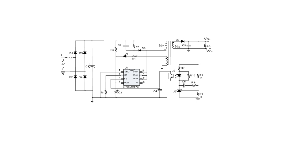 SP6609HPS內(nèi)置多種保護(hù),包括逐周期限流保護(hù)(OCP),過(guò)載保護(hù)(OLP),過(guò)壓保護(hù)(OVP),VDD過(guò)壓箝位,欠壓保護(hù)(UVLO),過(guò)溫保護(hù)(OTP)等,通過(guò)內(nèi)部的圖騰柱驅(qū)動(dòng)結(jié)構(gòu)可以更好的改善系統(tǒng)的EMI特性和開(kāi)關(guān)的軟啟動(dòng)控制。