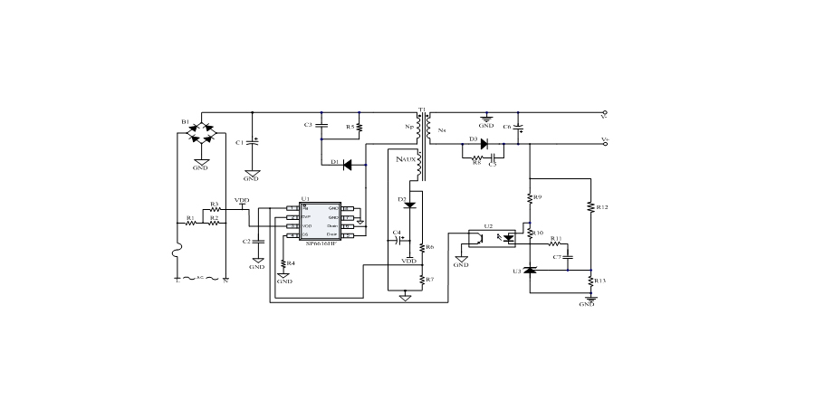 SP6616HF是一顆電流模式PWM控制芯片,內(nèi)置650V高壓功率MOSFET,應(yīng)用于功率在12W以內(nèi)的方案。SP6616HF在PWM模式下工作于固定開關(guān)頻率,這個頻率是由內(nèi)部精確設(shè)定。在空載或者輕載時(shí),工作頻率由IC內(nèi)部調(diào)整。芯片可以工作在綠色模式,以此來減小輕載時(shí)的損耗,提高整機(jī)的工作效率。SP6616HF在啟動和工作時(shí)只需要很小的電流,可以在啟動電路中使用一個很大的電阻,以此來進(jìn)一步減小待機(jī)時(shí)的功耗。芯片內(nèi)置有斜坡補(bǔ)償電路,當(dāng)電路工作于大占空比時(shí),避免次諧波振蕩的發(fā)生,改善系統(tǒng)的穩(wěn)定性。內(nèi)置有前沿消隱時(shí)(Leading-edge blanking time),消除緩沖網(wǎng)絡(luò)中的二極管反向恢復(fù)電流對電路的影響。SP6616HF采用了抖頻技術(shù),能夠有效改善系統(tǒng)的EMI性能。系統(tǒng)的跳頻頻率設(shè)置在音頻(20KHz)以上,在工作時(shí)可以避免系統(tǒng)產(chǎn)生噪音。SP6616HF內(nèi)置多種保護(hù),包括輸出過壓保護(hù)(VOUT OVP),逐周期限流保護(hù)(OCP),過載保護(hù)(OLP),過壓保護(hù)(VDD OVP),VDD過壓箝位,欠壓保護(hù)(UVLO),過溫保護(hù)(OTP)等,通過內(nèi)部的圖騰柱驅(qū)動結(jié)構(gòu)可以更好的改善系統(tǒng)的EMI特性和開關(guān)的軟啟動控制