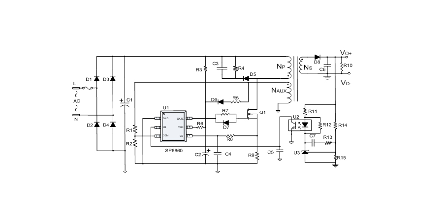 SP6660是一顆高性能、多工作模式的PWM控制芯片。芯片可以工作在跳頻及綠色模式,以此來減小空載和輕載時的損耗,也可以工作在QR工作模式及CCM工作模式,提高整機的工作效率。SP6660在啟動和工作時只需要很小的電流,可以在啟動電路中使用一個很大的電阻,以此來進(jìn)一步減小待機時的功耗。SP6660內(nèi)置多種保護,包括:輸入電壓過低保護(Brown-out),輸入電壓過高保護(Lineovp),輸出電壓過壓保護(VO_OVP),輸出二極管短路保護,逐周期過流保護(OCP),過載保護(OLP),VDD過壓保護(OVP),VDD欠壓保護(UVLO),過溫保護(OTP)等。