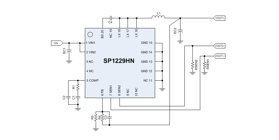 SP1229HN適用于有限流要求的DC/DC開關(guān)電源,芯片采用QFN20L-5×5封裝,僅需較少的外部器件。