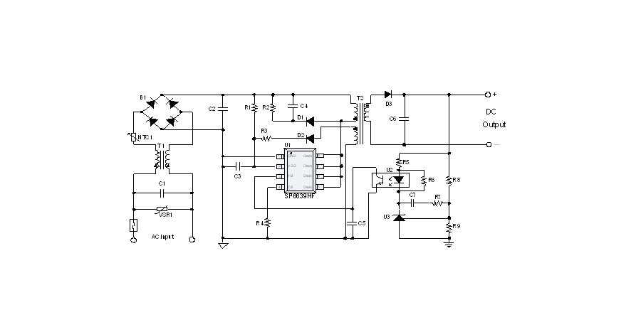 SP6639HF是一顆電流模式PWM控制芯片,內(nèi)置功率MOSFET,用于功率在27W以內(nèi)的方案。該芯片在系統(tǒng)輸出空載時(shí)工作在跳頻模式,在系統(tǒng)輸出輕載到中等負(fù)載階段工作在PFM模式,在輸出重載時(shí)工作在最大恒定工作頻率。SP6639HF的啟動(dòng)電流和工作電流設(shè)定的比較小,以此減小待機(jī)時(shí)的功耗。芯片內(nèi)置有斜坡補(bǔ)償電路,避免次諧波振蕩的發(fā)生,改善系統(tǒng)的穩(wěn)定性。芯片內(nèi)置有前沿消隱時(shí)間(Leading-edge blanking time),消除緩沖網(wǎng)絡(luò)中的二極管反向恢復(fù)電流對(duì)電路的影響。該芯片帶有抖頻功能,能夠有效改善系統(tǒng)的EMI性能。芯片最低的工作頻率設(shè)置在音頻以上,在工作時(shí)可以避免系統(tǒng)產(chǎn)生噪音。SP6639HF內(nèi)置多種保護(hù),包括逐周期限流保護(hù)(OCP),過(guò)壓保護(hù)(OVP),VDD過(guò)壓箝位,欠壓保護(hù)(UVLO),過(guò)溫保護(hù)(OTP)等,通過(guò)內(nèi)部的圖騰柱驅(qū)動(dòng)結(jié)構(gòu)可以更好的改善系統(tǒng)的EMI特性和開關(guān)的軟啟動(dòng)控制。