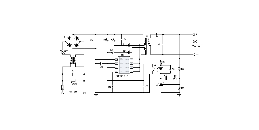 SP6638HF是一顆電流模式PWM控制芯片,內置功率MOSFET,用于功率在18W以內的方案。該芯片在系統(tǒng)輸出空載時工作在跳頻模式,在系統(tǒng)輸出輕載到中等負載階段工作在PFM模式,在輸出重載時工作在最大恒定工作頻率。SP6638HF的啟動電流和工作電流設定的比較小,以此減小待機時的功耗。芯片內置有斜坡補償電路,避免次諧波振蕩的發(fā)生,改善系統(tǒng)的穩(wěn)定性。芯片內置有前沿消隱時間(Leading-edge blanking time),消除緩沖網絡中的二極管反向恢復電流對電路的影響。該芯片帶有抖頻功能,能夠有效改善系統(tǒng)的EMI性能。芯片最低的工作頻率設置在音頻以上,在工作時可以避免系統(tǒng)產生噪音。SP6638HF內置多種保護,包括逐周期限流保護(OCP),過壓保護(OVP),VDD過壓箝位,欠壓保護(UVLO),過溫保護(OTP)等,通過內部的圖騰柱驅動結構可以更好的改善系統(tǒng)的EMI特性和開關的軟啟動控制。SP6638HF使用SOP8無鉛封裝。