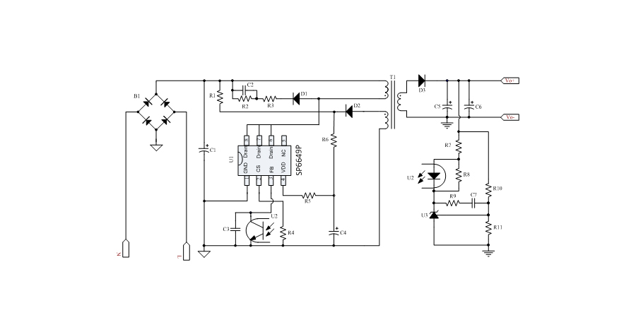 SP6649P內(nèi)置多種保護(hù),包括逐周期限流保護(hù)(OCP),過載保護(hù)(OLP),過壓保護(hù)(VDD OVP),VDD過壓箝位,欠壓保護(hù)(UVLO),過溫保護(hù)(OTP)等,通過內(nèi)部的圖騰柱驅(qū)動結(jié)構(gòu)可以更好的改善系統(tǒng)的EMI特性和開關(guān)的軟啟動控制。