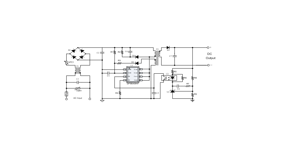 SP6649HF是一顆電流模式PWM控制芯片,內(nèi)置650V高壓功率MOSFET,應(yīng)用于功率在30W以內(nèi)的方案。SP6649HF在PWM模式下工作于固定開關(guān)頻率,這個頻率是由內(nèi)部精確設(shè)定。在空載或者輕載時,工作頻率由IC內(nèi)部調(diào)整。芯片可以工作在綠色模式,以此來減小輕載時的損耗,提高整機的工作效率。SP6649HF在啟動和工作時只需要很小的電流,可以在啟動電路中使用一個很大的電阻,以此來進(jìn)一步減小待機時的功耗。芯片內(nèi)置有斜坡補償電路,當(dāng)電路工作于大占空比時,避免次諧波振蕩的發(fā)生,改善系統(tǒng)的穩(wěn)定性。內(nèi)置有前沿消隱時(Leading-edge blanking time),消除緩沖網(wǎng)絡(luò)中的二極管反向恢復(fù)電流對電路的影響。SP6649HF采用了抖頻技術(shù),能夠有效改善系統(tǒng)的EMI性能。系統(tǒng)的跳頻頻率設(shè)置在音頻(22KHz)以上,在工作時可以避免系統(tǒng)產(chǎn)生噪音。SP6649HF內(nèi)置多種保護(hù),包括逐周期限流保護(hù)(OCP),過載保護(hù)(OLP),過壓保護(hù)(VDD OVP),VDD過壓箝位,欠壓保護(hù)(UVLO),過溫保護(hù)(OTP)等,通過內(nèi)部的圖騰柱驅(qū)動結(jié)構(gòu)可以更好的改善系統(tǒng)的EMI特性和開關(guān)的軟啟動控制。