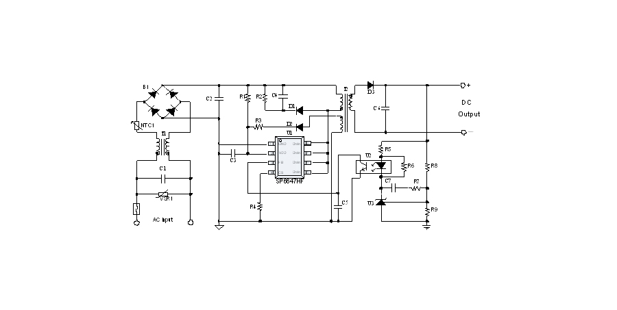 SP6647HF是一顆電流模式PWM控制芯片,內(nèi)置650V高壓功率MOSFET,應(yīng)用于功率在15W以內(nèi)的方案。SP6647HF在PWM模式下工作于固定開(kāi)關(guān)頻率,這個(gè)頻率是由內(nèi)部精確設(shè)定。在空載或者輕載時(shí),工作頻率由IC內(nèi)部調(diào)整。芯片可以工作在綠色模式,以此來(lái)減小輕載時(shí)的損耗,提高整機(jī)的工作效率。SP6647HF在啟動(dòng)和工作時(shí)只需要很小的電流,可以在啟動(dòng)電路中使用一個(gè)很大的電阻,以此來(lái)進(jìn)一步減小待機(jī)時(shí)的功耗。芯片內(nèi)置有斜坡補(bǔ)償電路,當(dāng)電路工作于大占空比時(shí),避免次諧波振蕩的發(fā)生,改善系統(tǒng)的穩(wěn)定性。內(nèi)置有前沿消隱時(shí)(Leading-edge blanking time),消除緩沖網(wǎng)絡(luò)中的二極管反向恢復(fù)電流對(duì)電路的影響。SP6647HF采用了抖頻技術(shù),能夠有效改善系統(tǒng)的EMI性能。系統(tǒng)的跳頻頻率設(shè)置在音頻(22KHz)以上,在工作時(shí)可以避免系統(tǒng)產(chǎn)生噪音。SP6647HF內(nèi)置多種保護(hù),包括逐周期限流保護(hù)(OCP),過(guò)載保護(hù)(OLP),過(guò)壓保護(hù)(VDD OVP),VDD過(guò)壓箝位,欠壓保護(hù)(UVLO),過(guò)溫保護(hù)(OTP)等,通過(guò)內(nèi)部的圖騰柱驅(qū)動(dòng)結(jié)構(gòu)可以更好的改善系統(tǒng)的EMI特性和開(kāi)關(guān)的軟啟動(dòng)控制。
