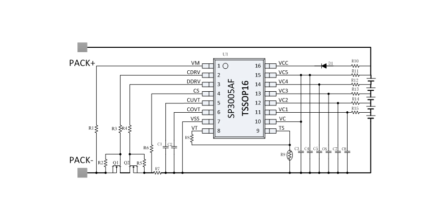 SP3005AF 是一款用于 5 串鋰電池的保護芯片,SP3005AF 內(nèi)部集成了高精度的電壓、電流檢測電路,能夠?qū)崿F(xiàn)每串電池的過壓、欠壓保護,以及整串電池的充電過流、放電過流、短路保護和充放電的溫度保護等。SP3005AF 內(nèi)部集成 N型 MOSFET 的驅(qū)動電路,能夠直接驅(qū)動外部 N 型充電管和放電管。