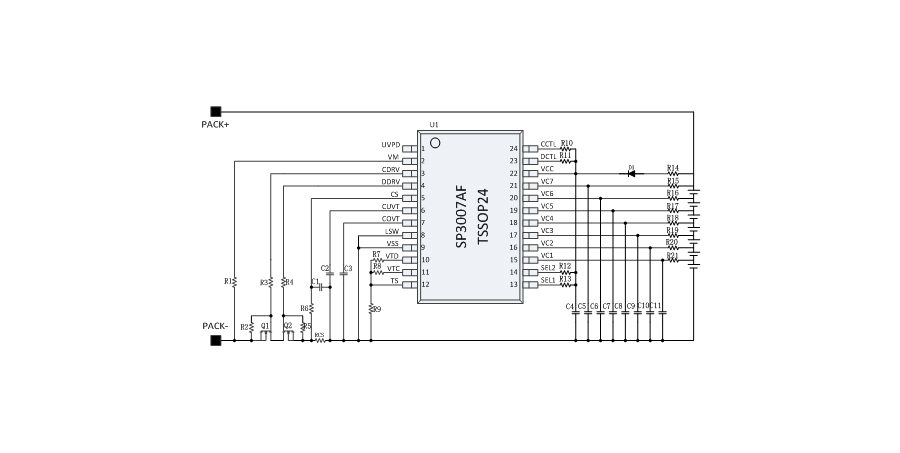 SP3007AF是一款用于6-7串鋰電池的保護(hù)芯片,SP3007AF 內(nèi)部集成了高精度的電壓、電流檢測電路,能夠?qū)崿F(xiàn)每串電池的過壓、欠壓保護(hù),以及整串電池的充電過流、放電過流、短路保護(hù)和充放電的溫度保護(hù)等。SP3007AF 內(nèi)部集成 N型 MOSFET 的驅(qū)動(dòng)電路,能夠直接驅(qū)動(dòng)外部 N 型充電管和放電管,既可以兼容充放電分口應(yīng)用,也可以兼容充放電同口應(yīng)用。