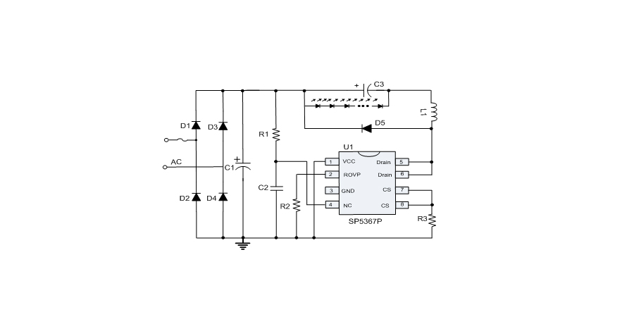 SP5367P內(nèi)部集成了一個500V高壓功率開關(guān)管,而且芯片的工作電流極低,降低了系統(tǒng)損耗,提高了效率。無需輔助繞組供電,減少了外圍元件的使用。采用了新型的電流檢測方式和驅(qū)動,即使在成本和體積都縮減的情況下也可實(shí)現(xiàn)優(yōu)異的恒流特性。SP5367P內(nèi)置高精度的電流采樣電路和特殊的恒流控制技術(shù),實(shí)現(xiàn)高精度的恒流輸出。芯片工作在電感電流臨界連續(xù)模式,輸出電流不會隨著電感量和輸出負(fù)載的變化而變化。