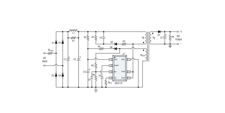 SP5717F是一顆高精度離線式開關(guān)電源電路,應(yīng)用于低功耗AC/DC充電器與適配器。SP5717F使用原邊取樣來進行精確的恒流、恒壓控制,可以省去一般應(yīng)用中的光耦與TL431。