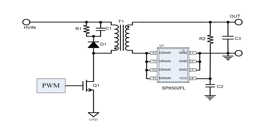 SP6502FL檢測內(nèi)置MOSFET的導(dǎo)通電阻(Rds-on)上的壓降,來控制MOSFET的開關(guān)。應(yīng)用外圍簡單。適用于5V輸出的應(yīng)用方案。