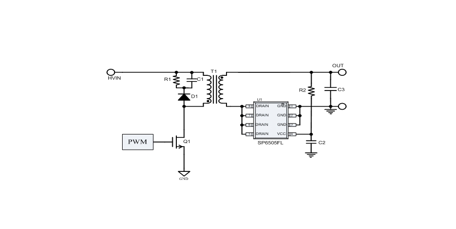 SP6505FL檢測內置MOSFET的導通電阻(Rds-on)上的壓降,來控制MOSFET的開關。應用外圍簡單。適用于5V輸出的應用方案。