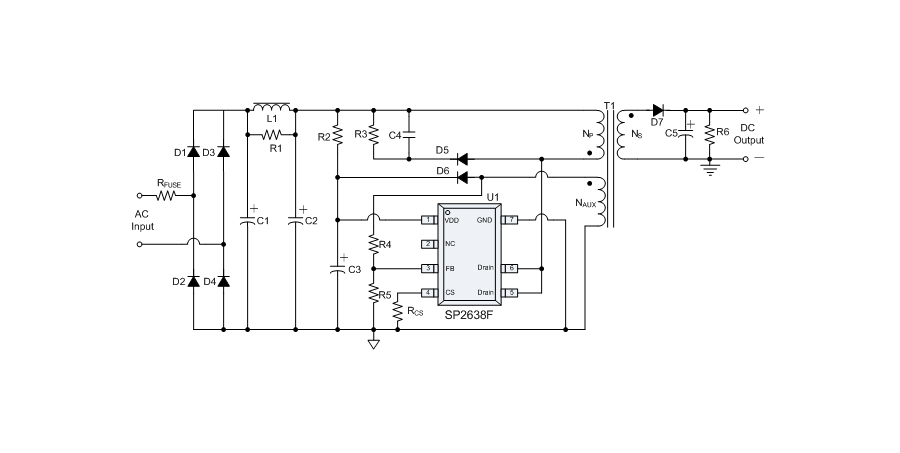 SP2638F 是一款性能優(yōu)異的原邊反饋控制電路,應(yīng)用于小功率 AC/DC 充電器與適配器。控制電路使用原邊采樣技術(shù)進(jìn)行精確的恒流、恒壓控制,可以省去一般應(yīng)用中的光耦與 TL431。