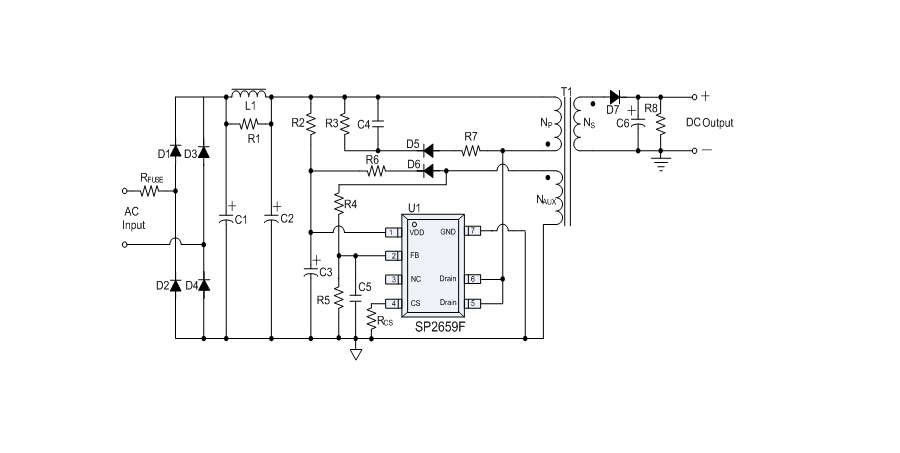 SP2659F是一款性能優(yōu)異的原邊反饋控制電路,應(yīng)用于小功率AC/DC充電器與適配器。控制電路使用原邊采樣技術(shù)進(jìn)行精確的恒流、恒壓控制,可以省去一般應(yīng)用中的光耦與TL431。