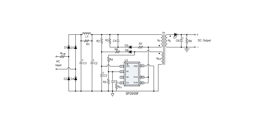 SP2655 提供全面的保護功能,包括逐周期限流保護(OCP)、VDD 過壓保護(OVP)、VDD 欠壓保護(UVLO)、反饋環(huán)路開路保護、輸出短路保護、輸出過壓保護、過溫保護等。其中,輸出短路保護、輸出過壓保護具有自動重啟恢復(fù)的功能。