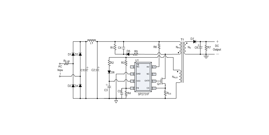 SP2731F是一款性能優(yōu)異的原邊反饋控制電路,應用于中、小功率AC/DC充電器與適配器??刂齐娐肥褂迷叢蓸蛹夹g進行精確的恒流、恒壓控制,可以省去一般應用中的光耦與TL431。