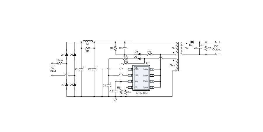 SP2738CF提供全面的保護功能,包括逐周期限流保護(OCP)、VDD過壓保護(OVP)、VDD欠壓保護(UVLO)、VDD鉗位、FB開/短路保護、輸出短路保護、輸出過壓保護、過溫保護等。